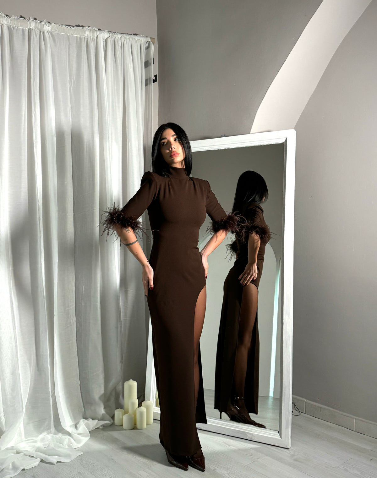 Siamo l'essenza del partywear artigianale: ogni capo è un pezzo unico, arricchito da strass cucite a mano e piume selezionate con cura.